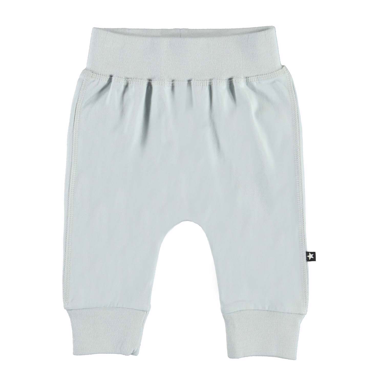 Sammy är ett par mjuka ljusa blågrå babybyxor med brett gummiband i midjan och vid benslut. Byxorna har synliga sömmar framtill vilket ger en sweatpantslook.