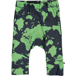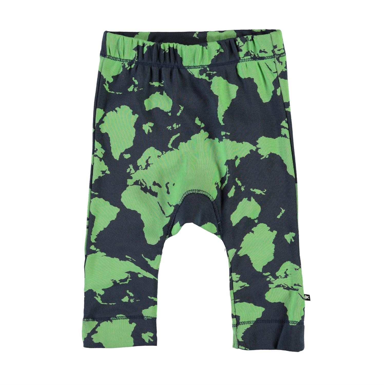 Seb är ett par babybyxor i blått och grönt med ett tryck av världskartan. Seb har smala ben och ribbad kant. Byxorna har en elastisk midja som säkerställer en bekväm passform.