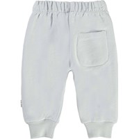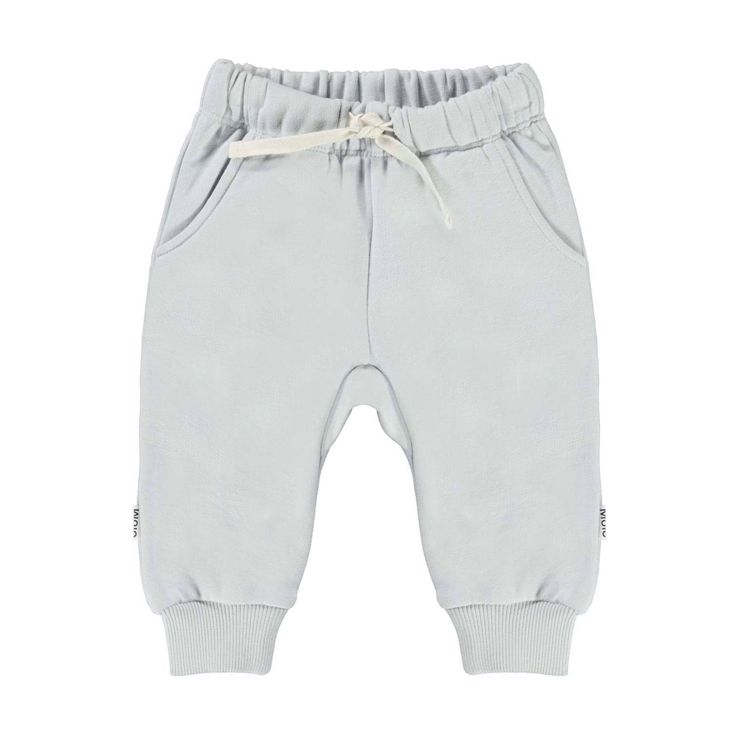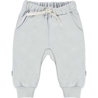 Simme är ett par mjuka och sköna ljusa gråblå babybyxor i en tjock tygkvalitet. Byxorna har knytband i midjan, fickor i sidorna och en enkel bakficka.
