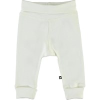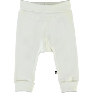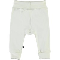 Son är ett par vita babybyxor med smala ränder. Byxorna har en vikt kant i midjan och vid benen.
