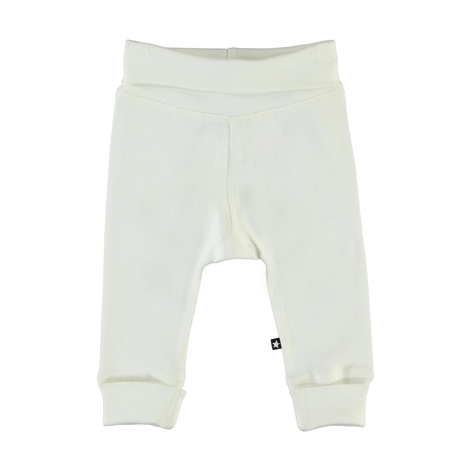 Son är ett par vita babybyxor med smala ränder. Byxorna har en vikt kant i midjan och vid benen.