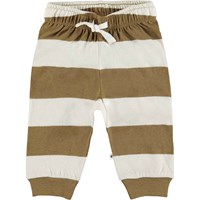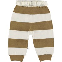 Summ är ett par mjuka randiga babybyxor i färgerna grön/brun och vit. Byxorna har en bred ribbad kant vid benslut och vitt knytband i midjan.