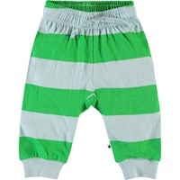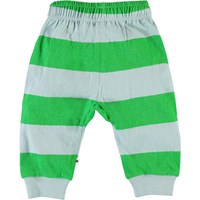 Summ är ett par lösa och bekväma babybyxor med gröna och blå ränder. Byxorna har knytband i midjan. Kombinera byxorna med matchande tröja.