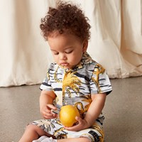 Solar är ett par babyshorts i ett vitt, svart och gult palmmönster. Solar har gummiband i midjan och Molo´s logga på ena benet. Kombinera med matchande skjorta, Eyou, och du har en komplett outfit.