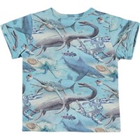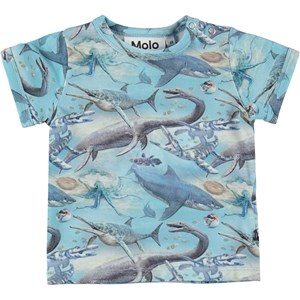 Easy är en blå baby t-shirt i 100% ekologisk bomullsjersey. T-shirten är med jhajar och bläckfiskar, men också förhistoriska havsdinosaurier.