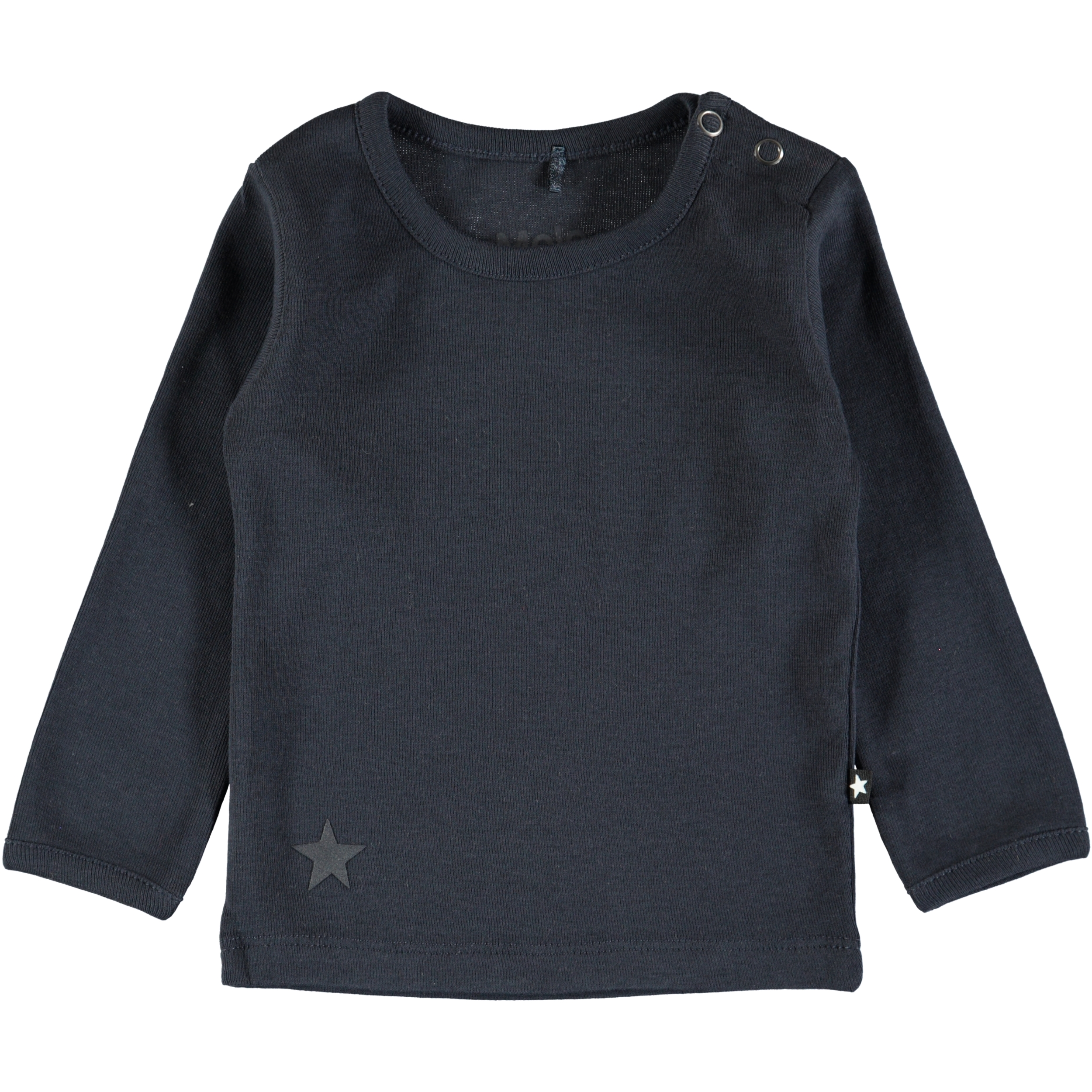 Långärmad, mörkblå basis blus i bomull till baby. Tryckknappar i halsringning gör blusen lätt att få av och på.