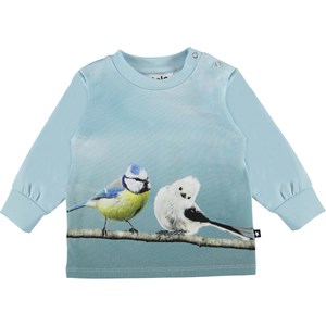 Eloy är en ljusblå babytröja med ett tryck på två fåglar på framsidan. Eloy har en knappstängning på ena axeln, vilket gör det enkelt att ta av och på.