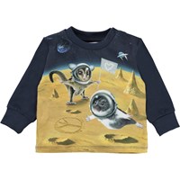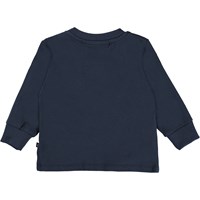 Eloy är en mörkblå babytröja med jordklotet och en smiley på. Eloy har knappa på ena axeln för att enkelt få den av och på.