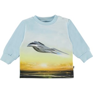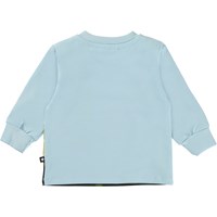 Eloy är en ljusblå babytröja med flygplan. Eloy har en knappstängning på ena axeln, vilket gör det enkelt att ta av och på.