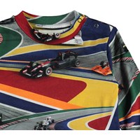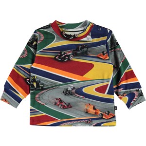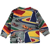 Eloy är en babytröja med ett tryck av färgglada racerbilar. Eloy har en knapp på ena axeln. Tröjan har blå ärmar samt baksida.