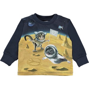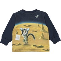Eloy är en mörkblå babytröja med olika djur som har åkt till månen. Eloy har knappar på ena axeln för att enkelt få den av och på.