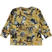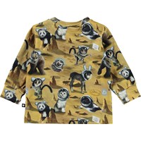 Eloy är en gul babytröja med olika djur på månen. Eloy har knappar på den ena axeln för att enkelt få den av och på.
