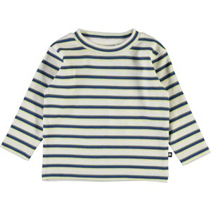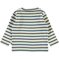 Elvo är en blå grå och gulrandig babytröja med långa ärmar.