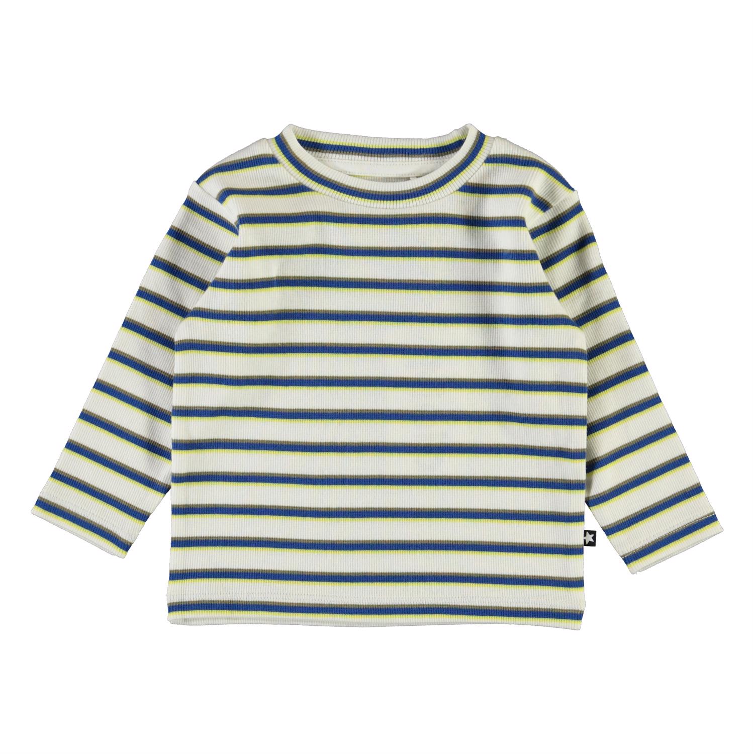 Elvo är en blå grå och gulrandig babytröja med långa ärmar.