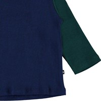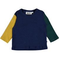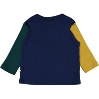 Elvo är en ribbad babytröja med färgblock i färgerna blå, grön och gul.