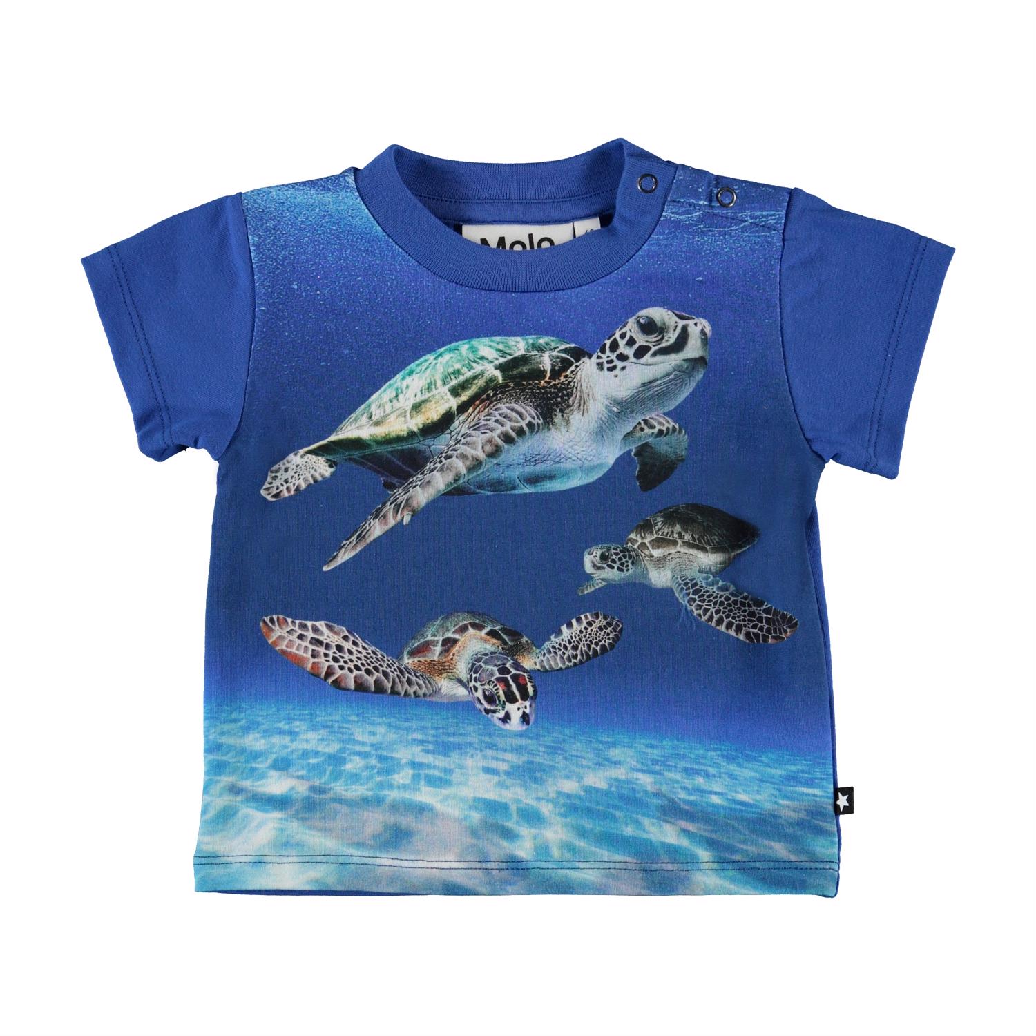 Emilio är en blå baby-t-shirt med ett tryck av sköldpaddor på framsidan. T-shirten har en knappstängning på ena axeln.