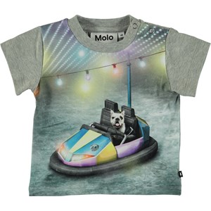 Även bulldogs är galna med Molo's "Bumper Car" tryck, här på baby t-shirten Emilio. Emilio är i bomull med knappknäppning på axeln.