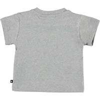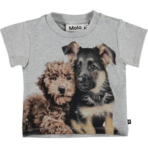 Grå baby t-shirt i ekologisk bomull med söta hundvalpsvänner. Emilio har en enkel knapp i halsen som gör den enkel att få av och på.