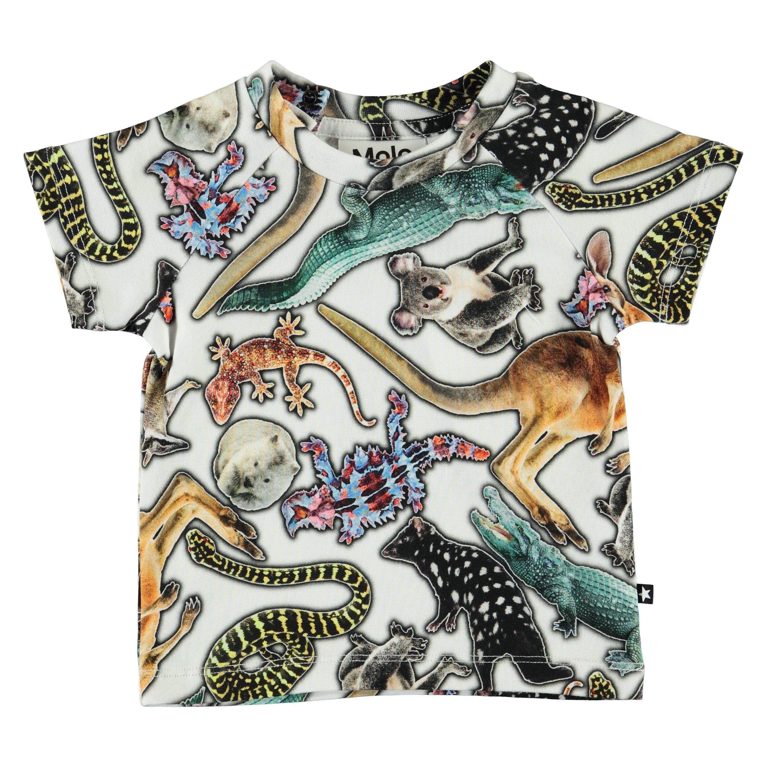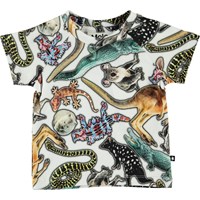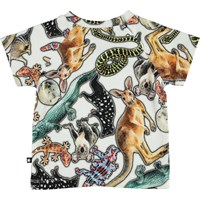 Emmett är en baby bomulls t-shirt med all-over tryck av Australiens vilda djur. Emmett har en knapp i nacken, som gör blusen lätt att ta av och på.