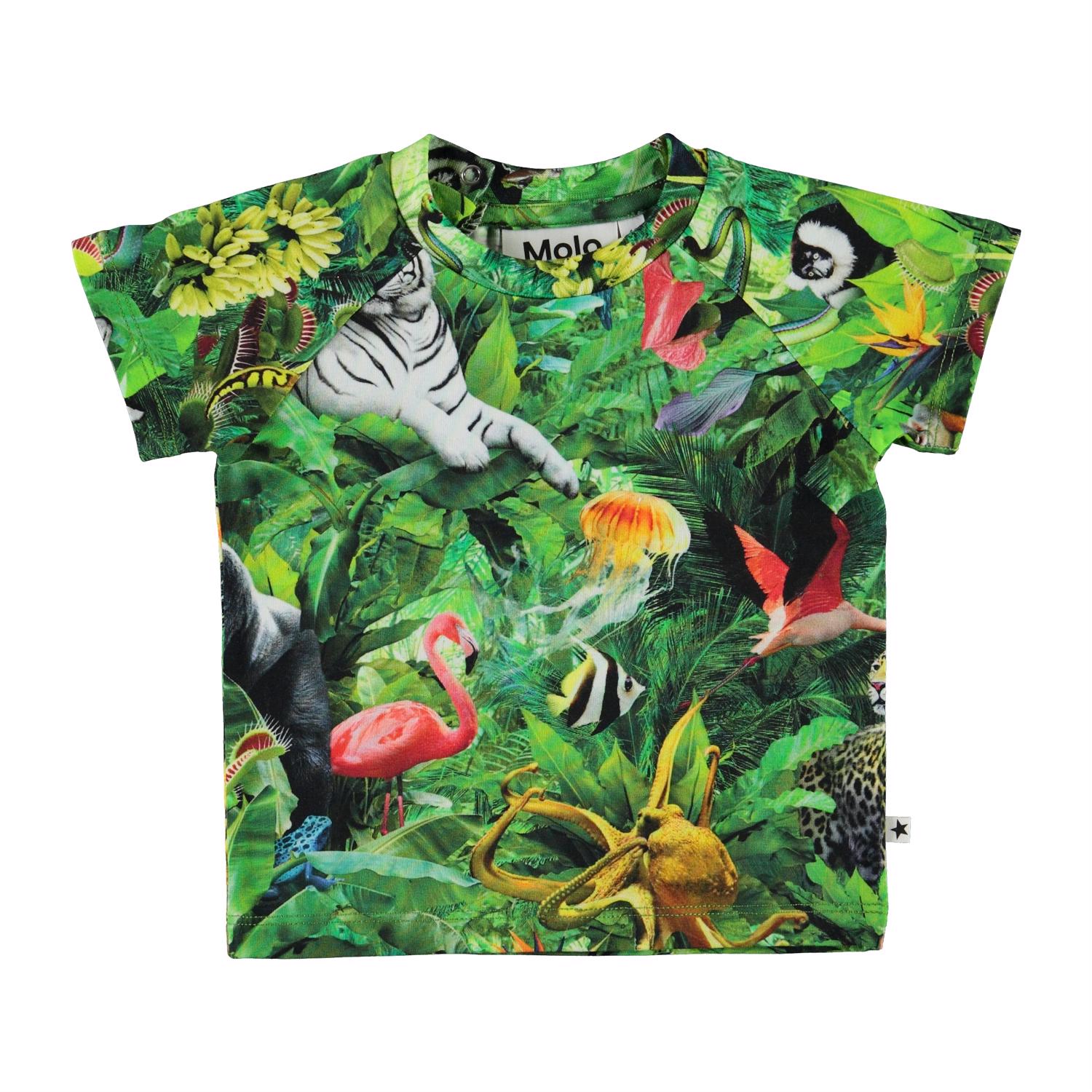 Emmett är en baby-t-shirt i bomull med trycket "Fantasy jungle" med flera djur på, som vanligtvis inte bor där. Emmett har en knapp i nacken, vilket gör att det är enkelt att ta av och på tröjan.