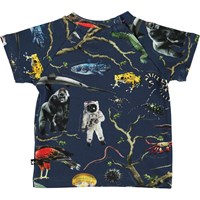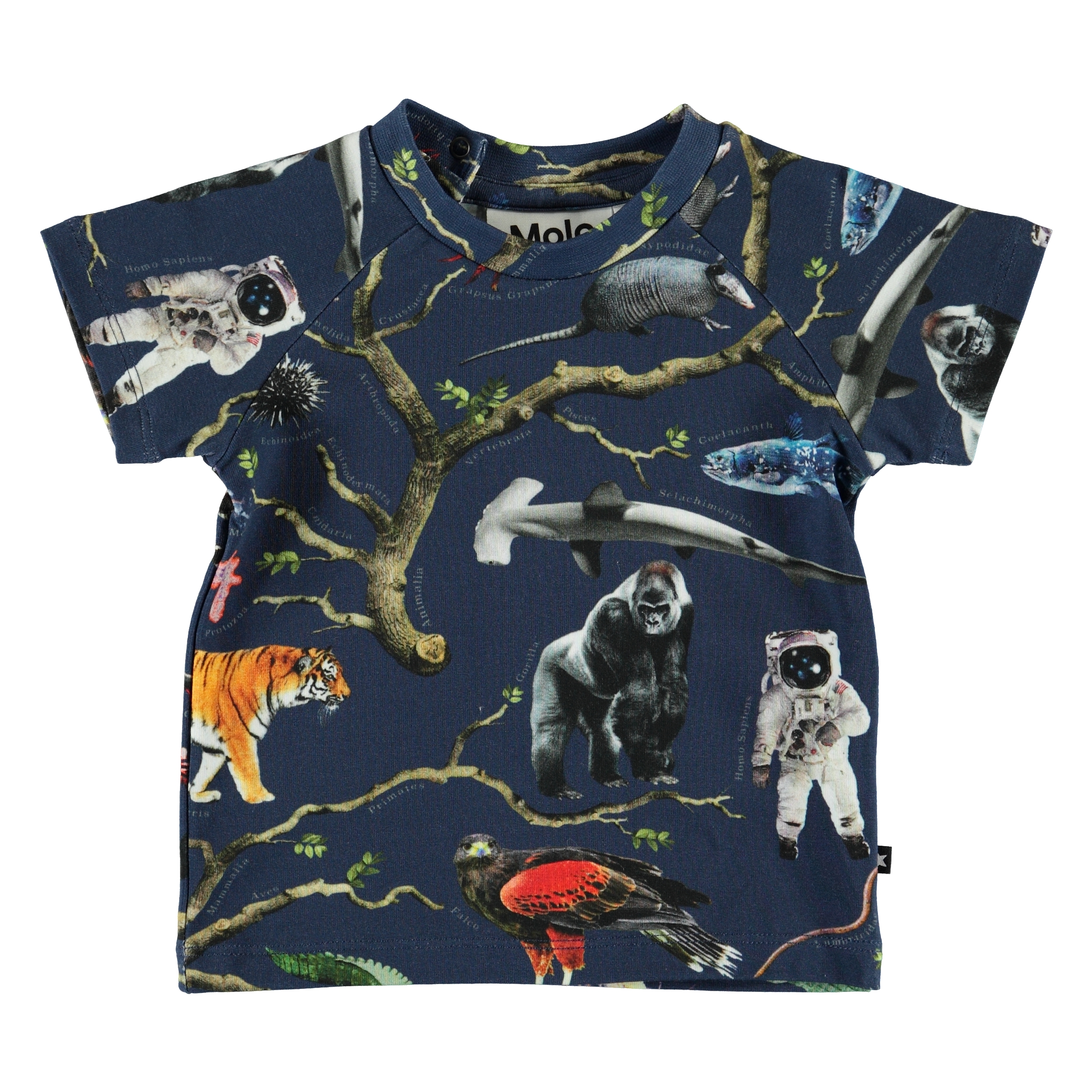 Utforska trycket 'Tree of Life' på baby t-shirten Emmett. I trycket gömmer sig både aliens och vilda djur. Emmett har en knapp i nacken, som gör blusen lätt att ta av och på.