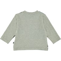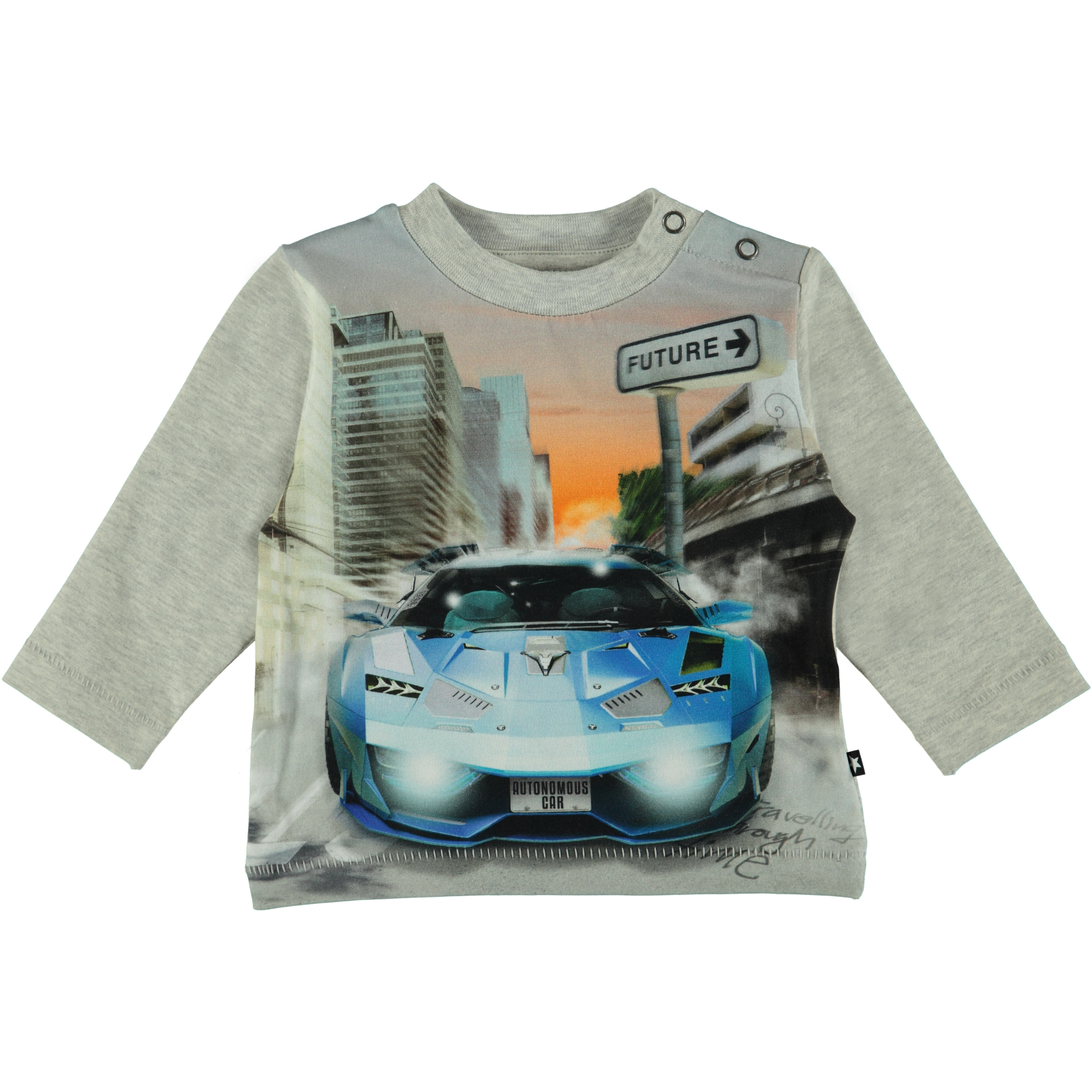 Långärmad, gråmelerad t-shirt med placement tryck framtill. Tryckknappar vid halsen gör t-shirten lätt att ta av och på.
