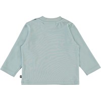 Enovan är en ljusblå babytröja med ett tryck av olika djurvänner på framsidan. Tröjan har en knapp på ena axeln, som gör tröjan enkel att ta av och på.