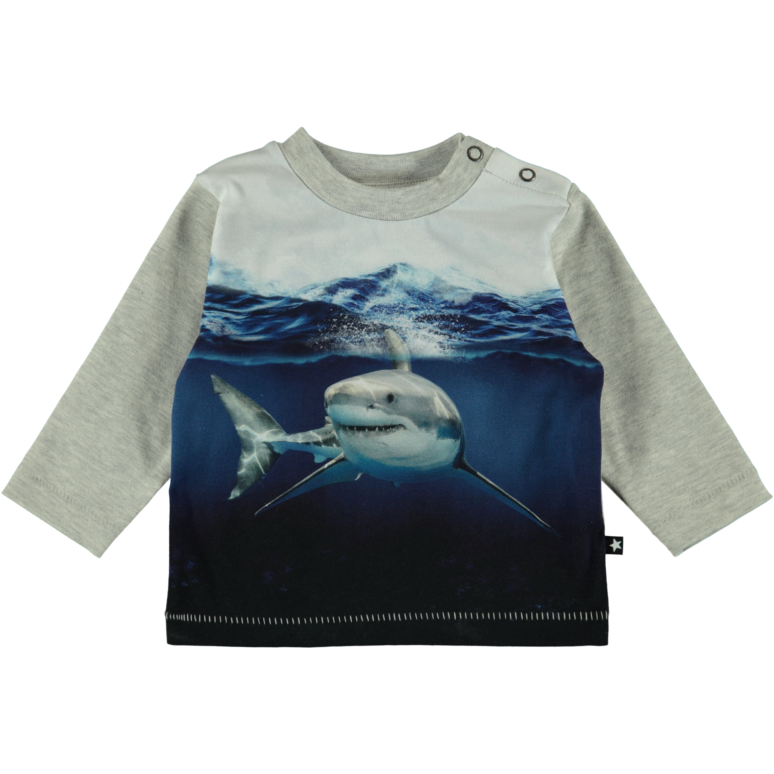Dyk ner i djupet och hitta en leende haj på Enovan med trycket "Friendly Shark". Enovan är en långärmad baby blus med grå ärmar och knappknäppning på ena axeln.