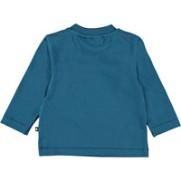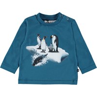 Pingvinerne har samlats i mitten av ett isblock fram på baby blusen Enovan. Enovan är i turkis blå och har knappknäppning på ena axeln.