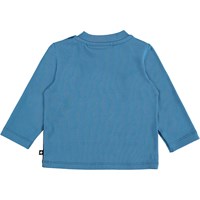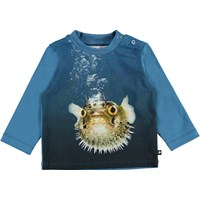 Enovan är en blå babytröja med ett tryck av en fisk på framsidan. Enovan har en knappstängning på ena axeln och mörkblå ärmar och rygg.