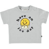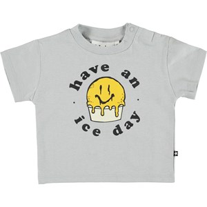 Enzo är en grå baby t-shirt med en söt bild av en smileyglass och texten `have an ice day`. Enzo har en enkel knapp vid halsen som gör det enkelt att få den av och på. T-shirten är mjuk och skön och tillverkad i bomull/linne blandning.