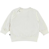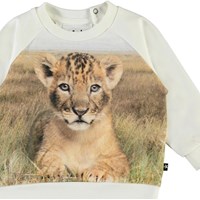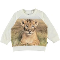 Esco är en vit babytröja med ett tryck av en lejonunge på framsidan. Blusen har en knappstängning i nacken, vilket gör det enkelt att ta av och på tröjan.
