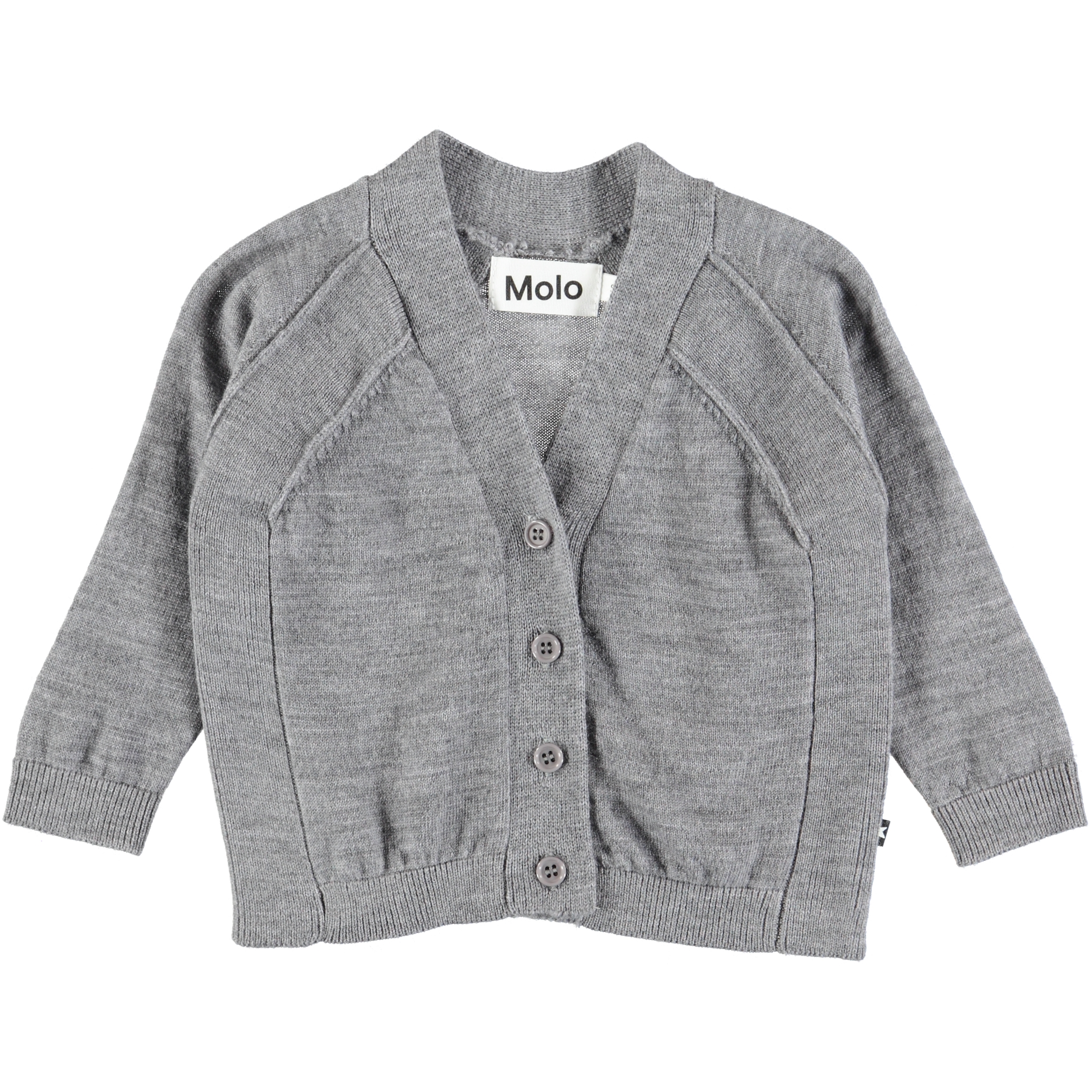 Söt, finstickad baby cardigan i grå ull med ribbkanter, synliga sömmar och knappar framtill.