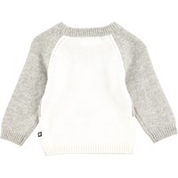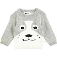 Långärmad baby stickad tröja i grått och vitt mönster av en hund. Tröjan är gjord i en skön cashmereblandning har mudd i hals, ärmslut och nederkant.