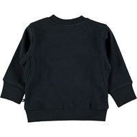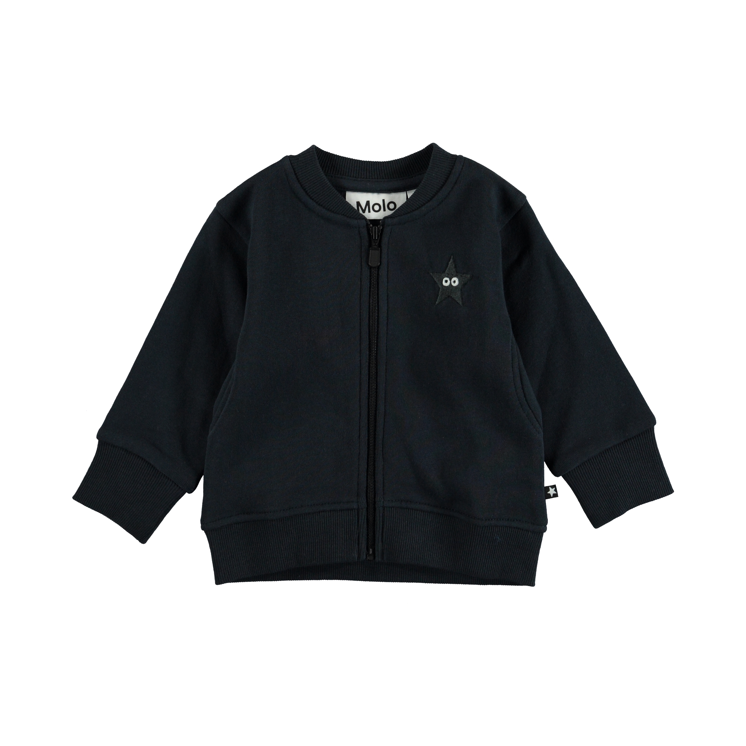 Derek är en mörkblå baby sweatshirt med dragkedja framtill. Derek har en mjuk, borstad insida, samt ribb vid hals, ärmslut och nederkant och broderad stjärna på bröstet.