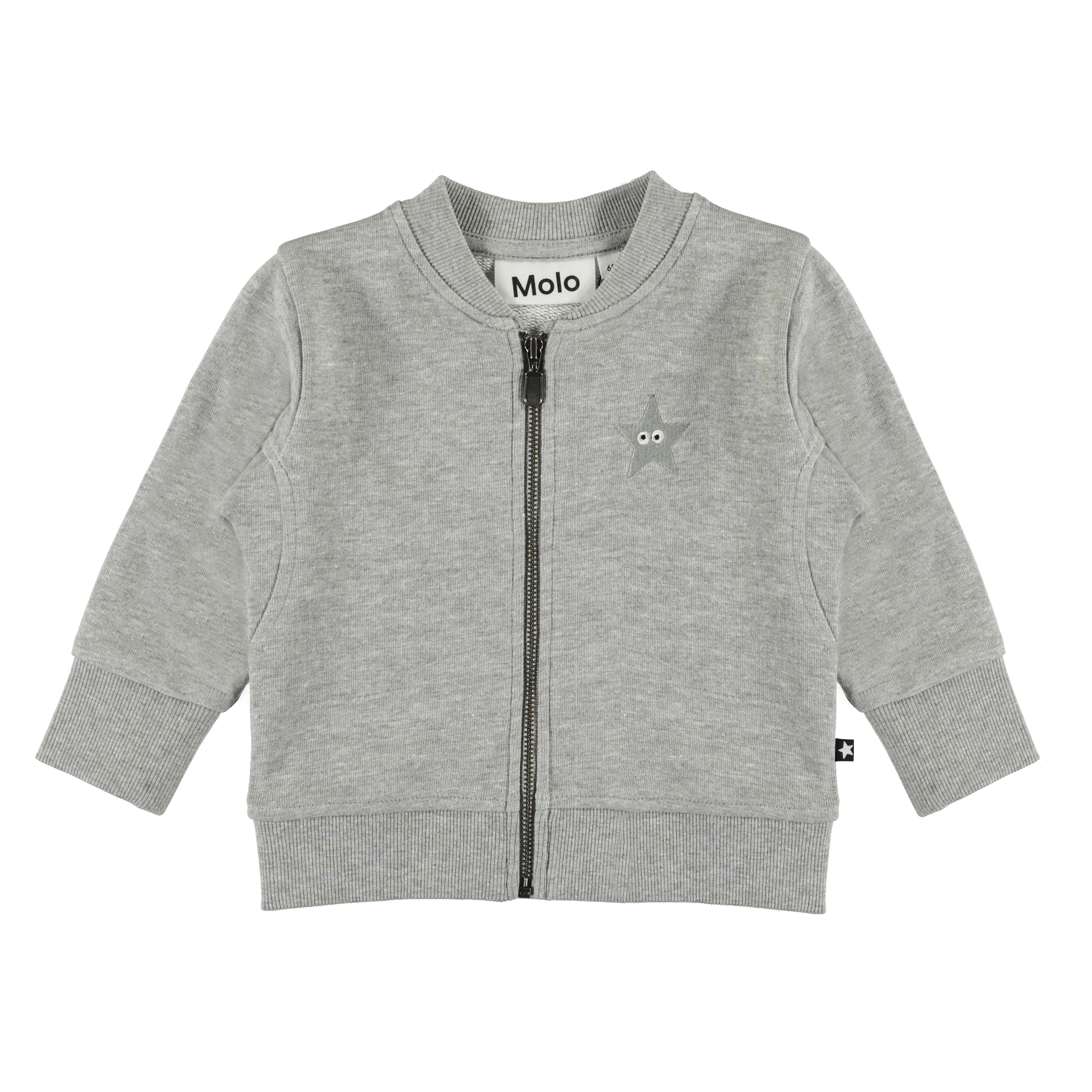 Derek är en grå baby sweatshirt med dragkedja framtill. Derek har en mjuk, borstad insida, samt ribb vid hals, ärmslut och nederkant och broderad stjärna på bröstet.
