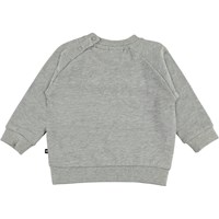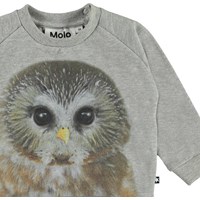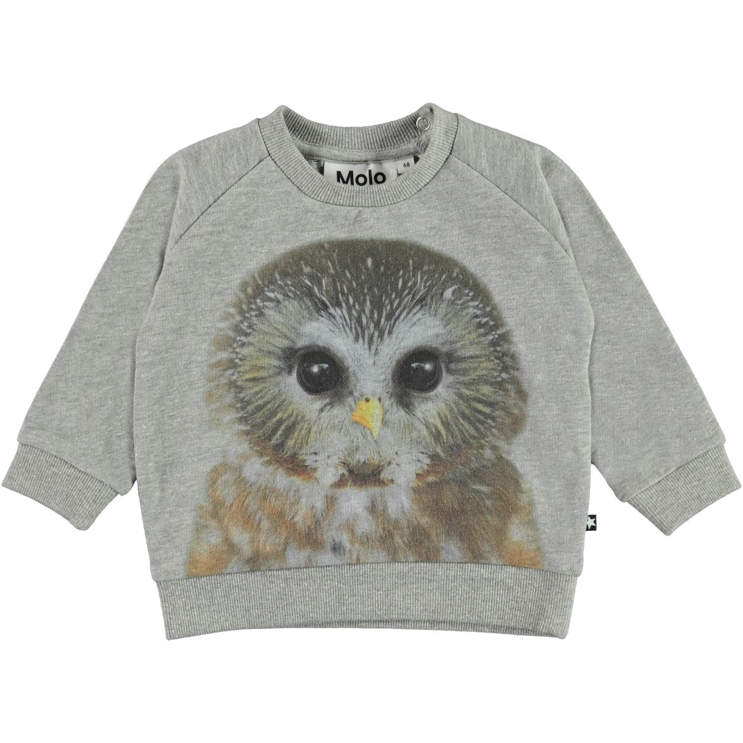 Disco er en baby sweatshirt i grå med print ugle på fronten. Sweatshirten knappes i nakkes bagpå.