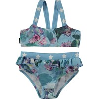 Fint bikiniset med digitaltryckta fåglar, volangdekorationer på trosorna samt matchande blå midjeband och axelband med tryckta Molo stjärnor. Axelbanden är fästa mitt på ryggen och tygets elasticitet ger en skön passform. Produkten har UV-skydd 50+.