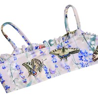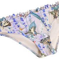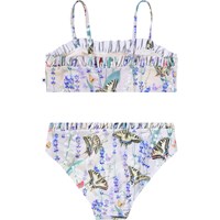 Stretchig, lila bikini för aktiva barn med fjärilsmönster i återvunnen polyester med UV-skydd 50+. Bikinitoppen är bred med volangdetaljer, tunna axelband och är helt fodrad. Bikinitrosan har en elastisk midja med volangkant, normal passform och är också helt fodrad.