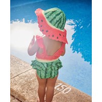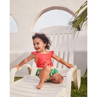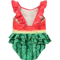 Baddräkt för de små i återvunnen polyester med UV-skydd 50+. Baddräkten har dekorativa volangdetaljer, en djup rygg, resår runt låren och en fodrad botten med plats för en blöja. Baddräkten har ett mönster av en stor, mogen vattenmelon. Produkten är CE-märkt och testad enligt standarden EN-13758-1.