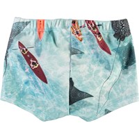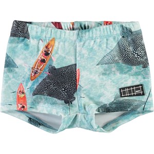 Nansen er et par korte badebukser til babyer og små børn i lyseblå med print af rokker. Badebukserne har elastisk talje, god bevægelighed og et ekstra indsyet indlæg for at sikre, at badebukserne holder tæt. Molo's badetøj har UV beskyttelse 50+. Produkten är CE-märkt och testad enligt standarden EN-13758-1.