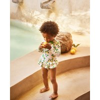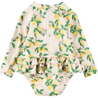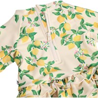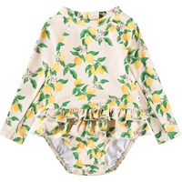 Gul baddräkt med citrusmönster för de små i återvunnen polyester med UV-skydd 50+. Den har volanger, långa raglanärmar, en dragkedja bak och tryckknappar i grenen för enkla blöjbyten. Botten är fodrad med resår och har plats för en blöja.