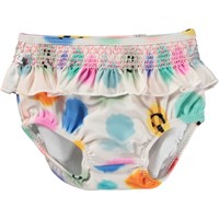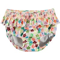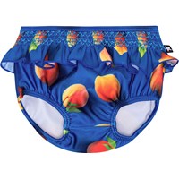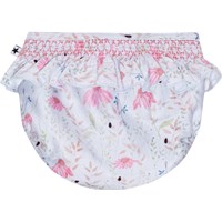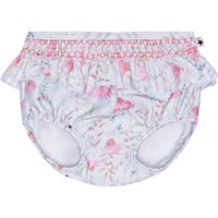 Ljusblå badbyxor till baby med rosa sommarblommor. Badbyxorna har plats till blöja och har en dekorativ volang och gummiband i midjan och vid benöppningen som säkrar att den sitter som den ska. De är tillverkad av återvunnen, elastisk polyester, vilket gör dem enkla att ta av och på. De har ett högt UV-skydd på 50+, som effektivt skyddar mot solens strålar. Produkten är CE-märkt och testad enligt standarden EN-13758-1.