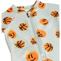 Grå baddräkt med orange basketmönster för de små i återvunnen polyester med UV-skydd 50+. Den har långa ärmar, korta ben, en dragkedja fram, en ståkrage och plats för blöja.