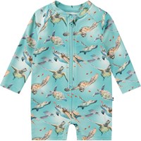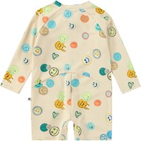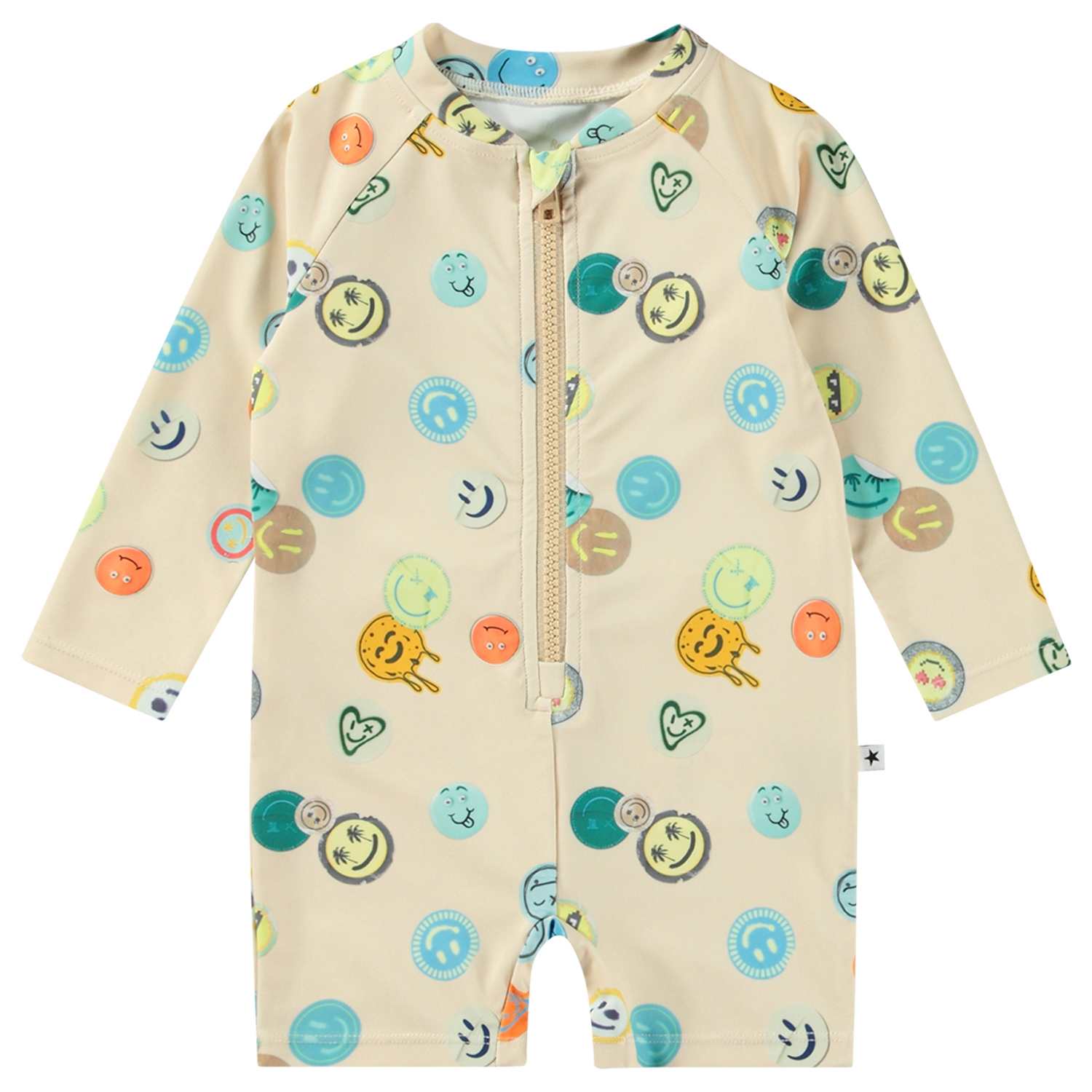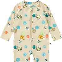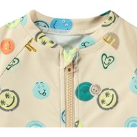 Baddräkt med långa ärmar och korta ben för de små, tillverkade av återvunnen polyester och med UV-skydd 50+. Baddräkten har en dragkedja framtill, vilket gör det enkelt att ta på och av den, samt en ståkrage och gott om plats för en blöja. Dräkten är beige med färgglada, leende ansikten. Produkten är CE-märkt och testad enligt standarden EN-13758-1.