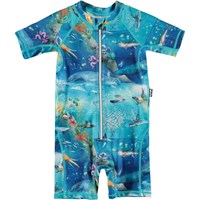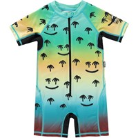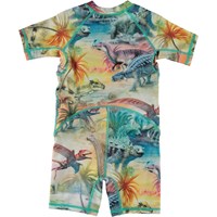 Baddräkt i rosa, turkos och orange nyanser med fantasifulla dinosaurier på en tropisk ö. Dräkten har dragkedja framtill, korta ärmar och ben som skyddar bra på utsatta områden. Den är tillverkad av återvunnen, elastisk polyester, vilket gör den enkel att ta av och på. Den har ett högt UV-skydd på 50+, som effektivt skyddar mot solens strålar. Produkten är CE-märkt och testad enligt standarden EN-13758-1.
