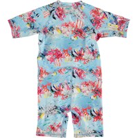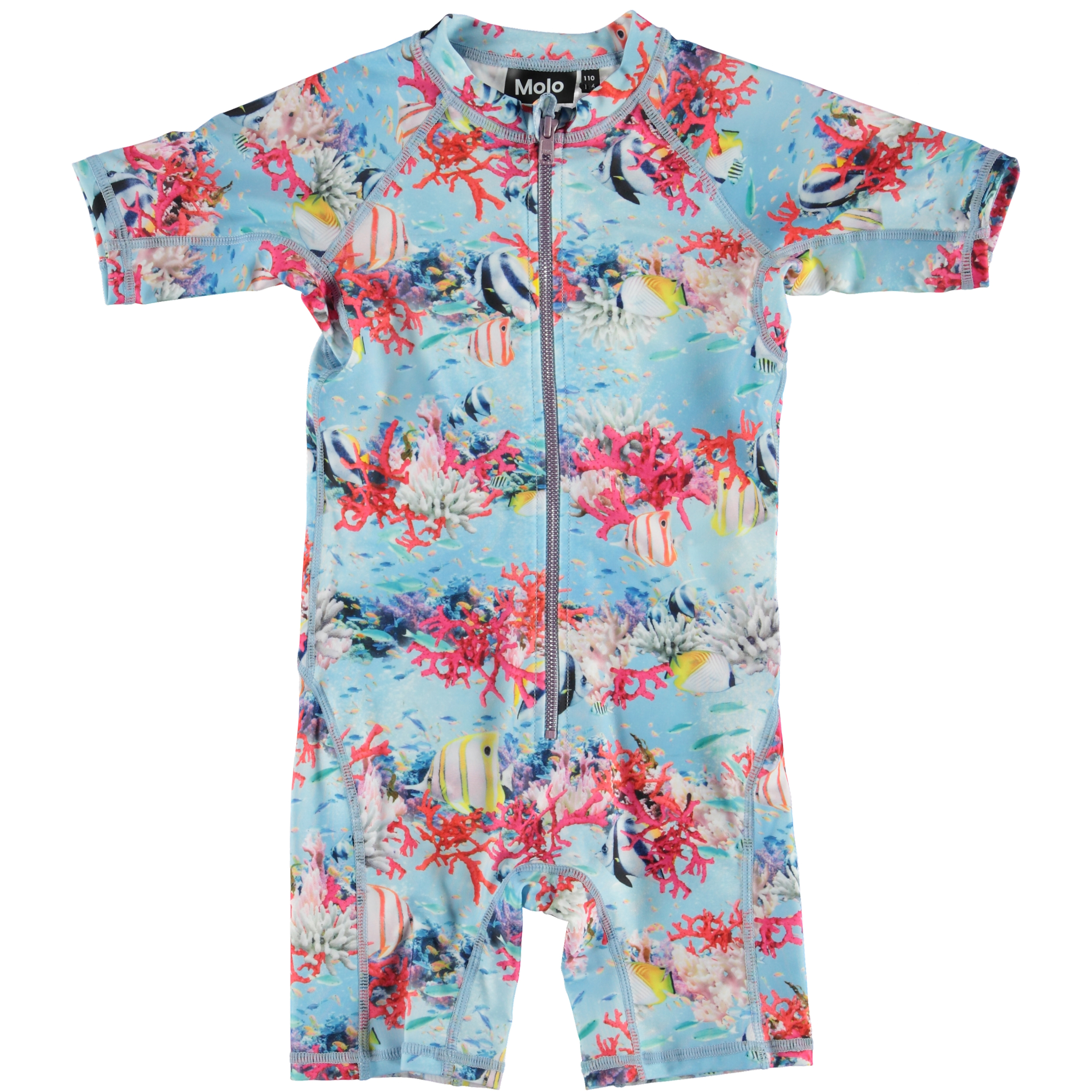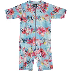 Neka är en praktisk UV baddräkt med trycket 'Coral Stripe'. Baddräkten har en lång dragkedja fram och tygets elasticitet gör baddräkten lätt att ta av och på och ger bra rörelsefrihet. Baddräkten täcker största delen av låret och överarmarna och ger ett effektivt solskydd till barnets utsatta områden. Molo's badkläder har UV skyddsfaktor 50+. Produkten är CE-märkt och testad enligt standarden EN-13758-1.
