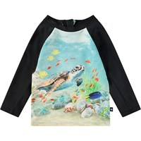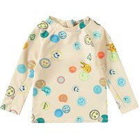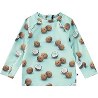 Badtröja för de små tillverkad av återvunnen polyester med UV-skydd 50+. Tröjan har en åtsittande passform, en ståkrage, en dragkedja på baksidan för enkel av- och påtagning, samt långa raglanärmar för att skydda mot solens strålar. Tröjan är ljusblå med färska kokosnötter. Produkten är CE-märkt och testad enligt standarden EN-13758-1.