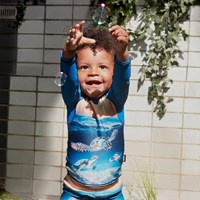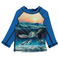 Nemo er en langærmet UV svømme bluse til de aller mindste, som beskytter mod solens skadelige stråler, da Molo's badetøj har UV beskyttelse 50+. Her er Nemo med blå ærmer, samt print af skildpadder og solnedgang. Blusen er tynd og rar at have på og har en god bevægelighed. Der findes underdel som matcher blusens print. Produkten är CE-märkt och testad enligt standarden EN-13758-1.