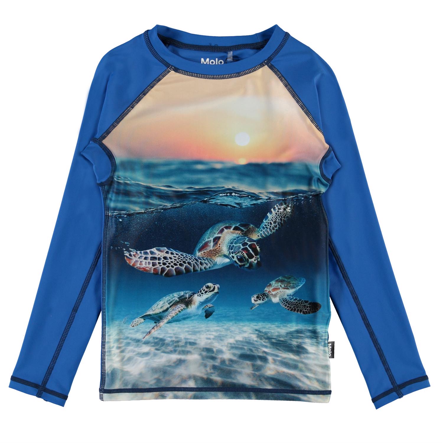 Neptune LS er en suveræn UV svømme t-shirt med blå ærmer og print af skildpadder under havets overflade og solnedgang for oven. T-shirten beskytter mod solens skadelige stråler. T-shirten er tynd og rar at have på og har en god bevægelighed. Kombiner t-shirten med de matchende shorts for et cool surfer look. Molo's badetøj har UV beskyttelse 50+. Produkten är CE-märkt och testad enligt standarden EN-13758-1.